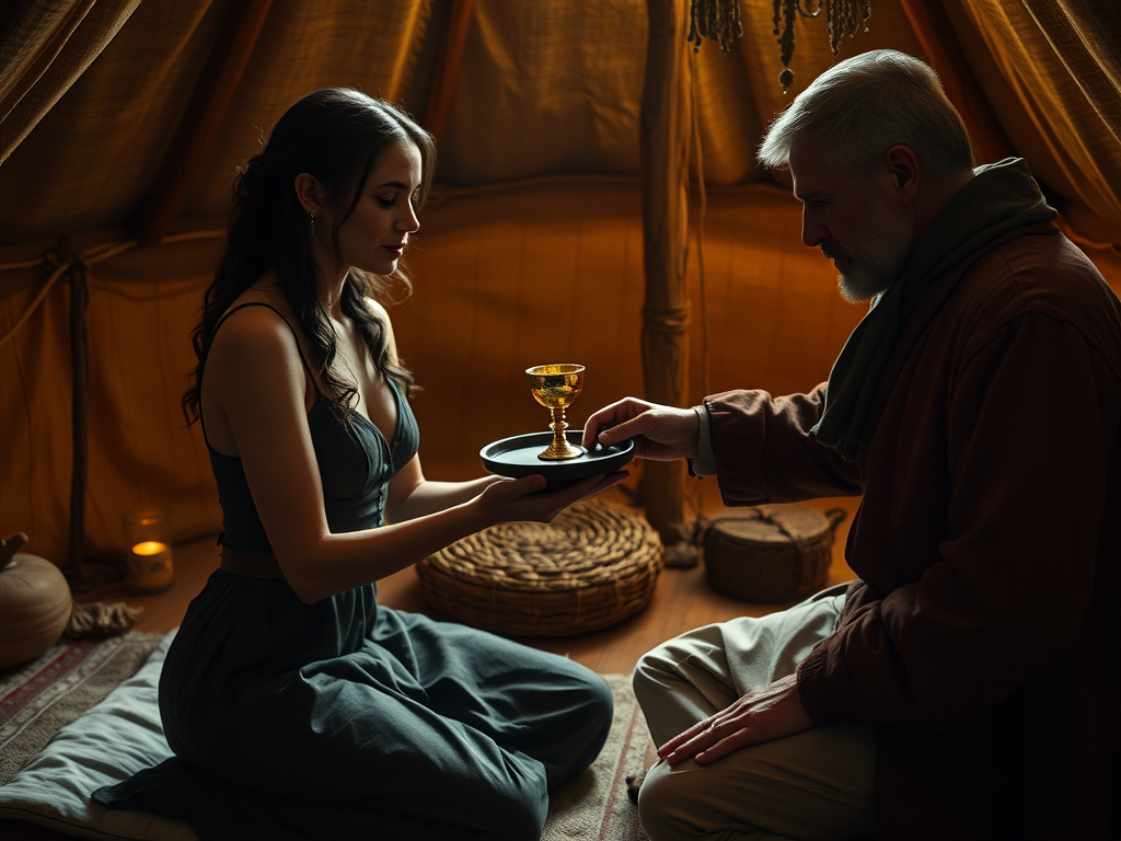 Under Kamchak’s keen eye (he even watches to be sure she doesn’t secretly poison the wine), Aphris breaks the bottle’s seal, then kneels before him “in the position of the Pleasure Slave”, head down and arms extended, offering him the filled wine crater. In that pose, her former arrogance is gone – she embodies submission, yet there is dignity in her careful, elegant movements. The narrative notes that Kamchak’s eyes glint with approval. By pouring and presenting the wine in this ritualistic manner, Aphris demonstrates a deep change in herself; she has gone from a haughty beauty to a willing servant, and the very act of serving wine is the proof.