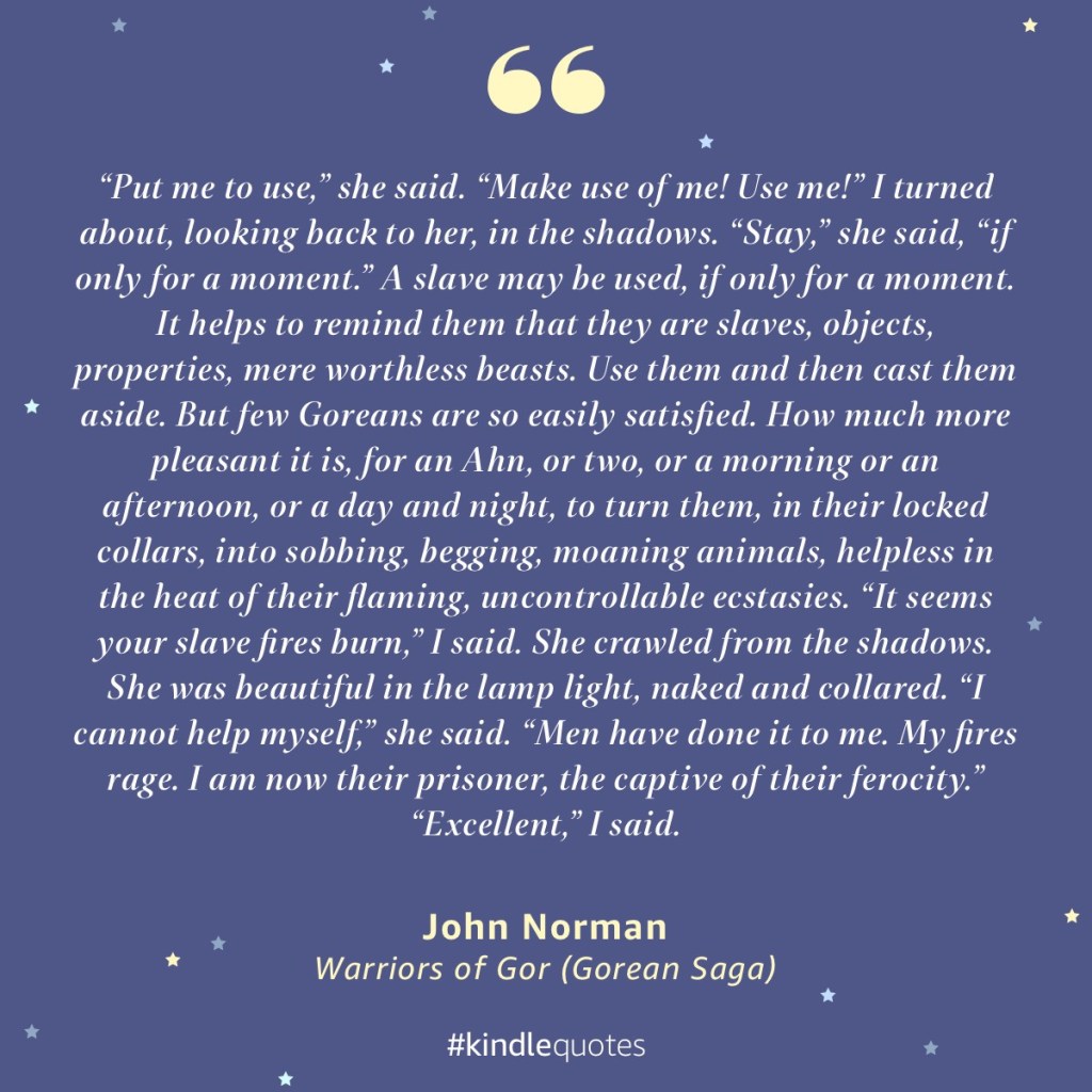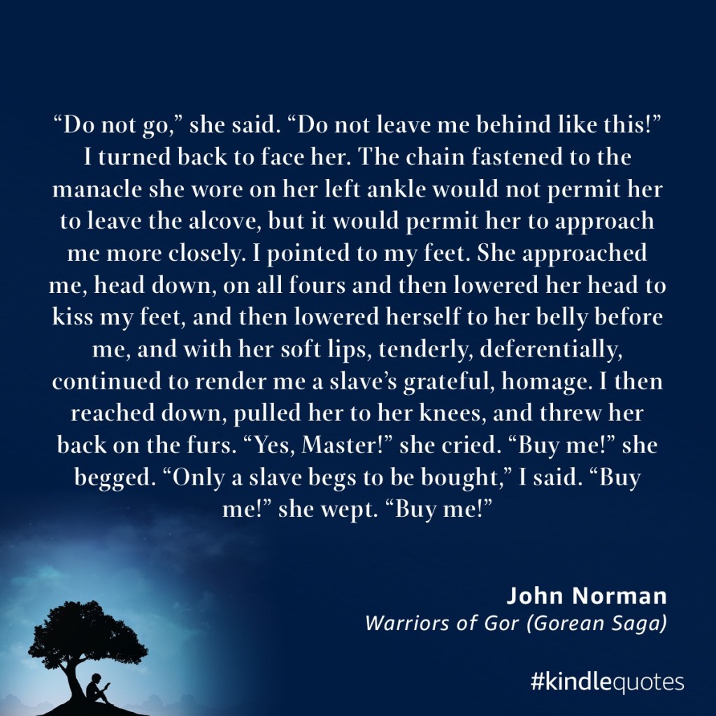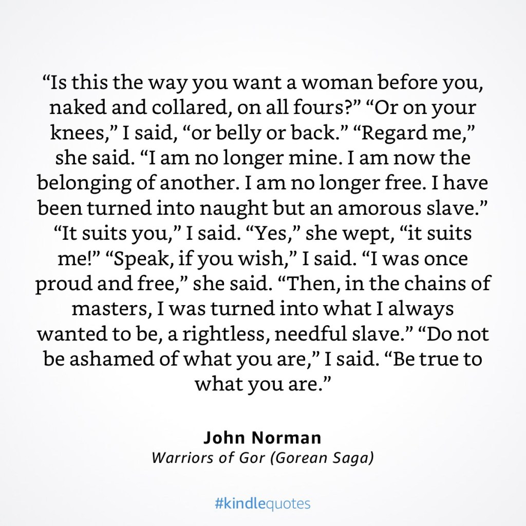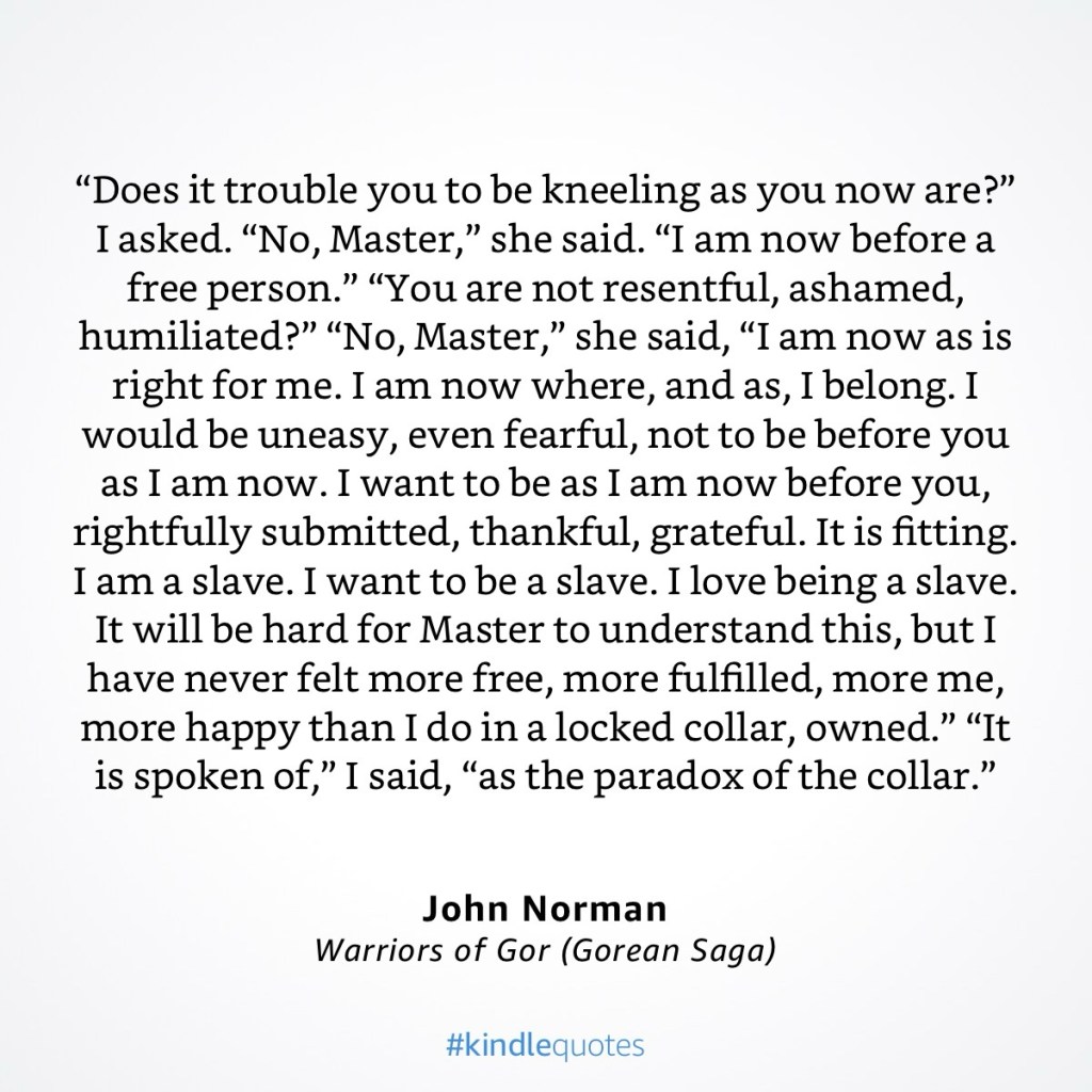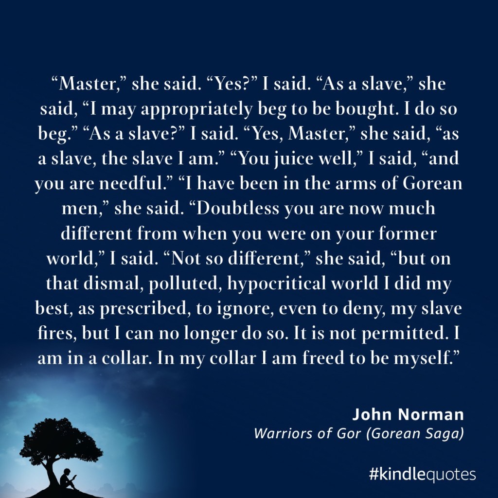 I had never heard of Gor, had no idea of what a kajira or a homestone were (or any other component of the Gorean saga), so I didn’t actually pay much attention to the comment, but my “sub” kept insisting that the quotes she was reading from the “Books of Gor” were very similar to the way I thought about things, that I decided to do some investigation on the topic.